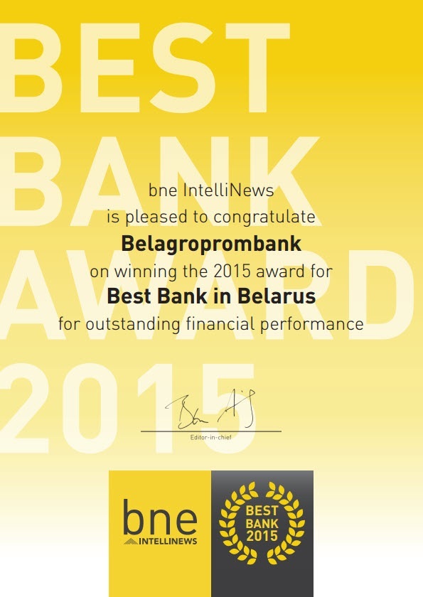 ОАО «Белагропромбанк» назван «Лучшим Банком в Беларуси» по версии журнала bne IntelliNews. Такие данные приводятся в ноябрьском выпуске журнала, в котором опубликован обзор банковского сектора стран Центральной и Восточной Европы за 2015 год.