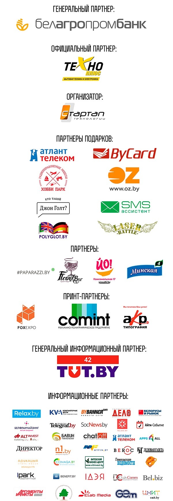 Организатором главного стартап-мероприятия выступил центр поддержки предпринимательства «Стартап технологии», при поддержке Минского городского исполнительного комитета. Генеральным партнером конкурса выступил ОАО «Белагропромбанк». Официальный партнер – сеть магазинов бытовой техники и электроники «ТЕХНО Плюс».