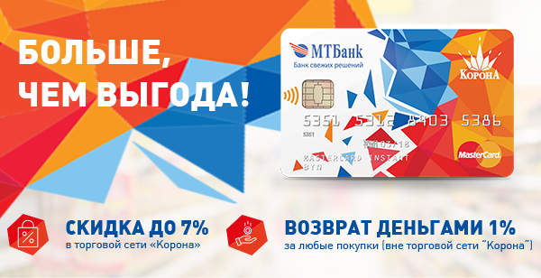 Новая карта «МТБанк-Корона» — полноценная банковская платежная карточка, имеющая одновременно и функции дисконтной программы «Магазин приятных покупок» сети магазинов «Корона». И как платежная, и как дисконтная карта, она дает своим обладателям дополнительные бонусы и возможности.