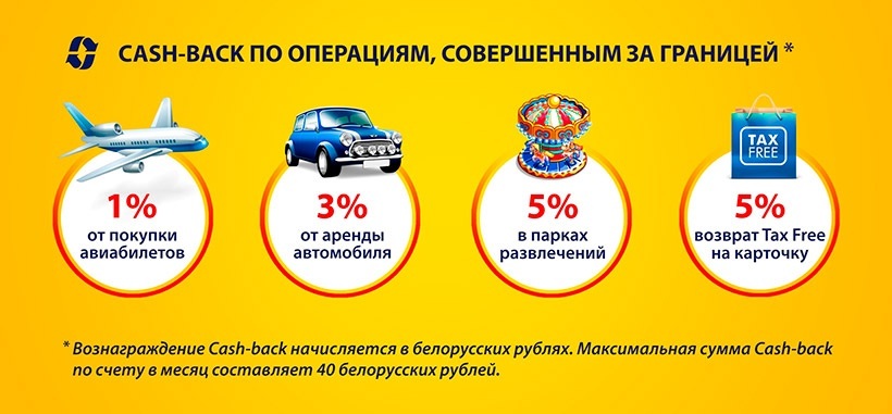 Держатели TRAVEL CARD могут вернуть часть потраченных средств, оплатив своей карточкой за пределами Республики Беларусь покупку авиабилетов – 1% от суммы, аренду автомобиля – 3% от суммы, покупки в парках развлечений – 5% от суммы и 5% при возврате Tax Free на карточку.