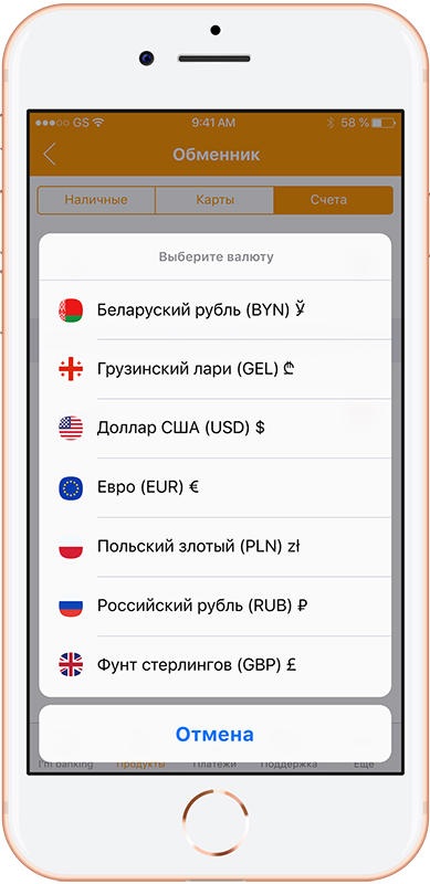 В мобильном приложении i’mbanking.by вы сможете бесплатно открыть текущие счета в следующих 7 валютах: BYN - Ў , GEL - ₾, USD - $, EUR - €, PLN - zł, RUB - ₽ и GBP - £. Счета в любой из этих 7 валют открываются без визита в банк за несколько секунд – представьте, быстрее, чем вы допьёте чашку эспрессо.