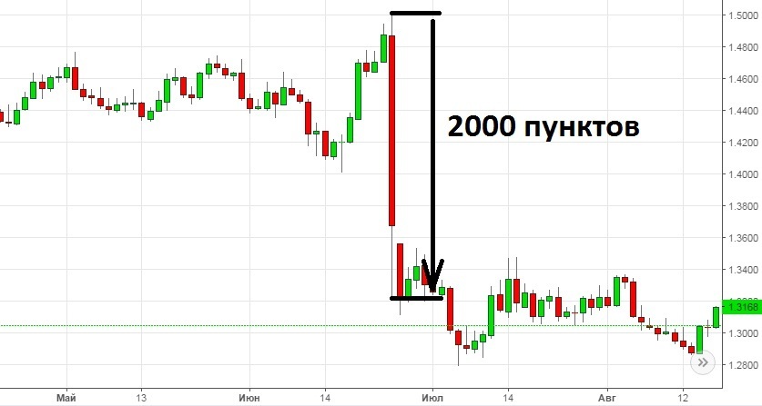 На графике видно, что фунт упал к доллару на 2000 пунктов. Это означает, что при совершении операции одним лотом можно было заработать до 20 000 долларов.