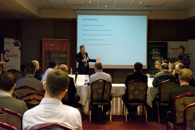 В программу «марафона информационной безопасности» вошел семинар «СТБ 34.101.27++: обновление требований к СКЗИ», который проходил под девизом «стандарт как компромисс». Провели семинар Станислав Владиленович Кутузов (Оперативно-аналитический центр) и Сергей Валерьевич Агиевич (НИИ прикладных проблем математики и информатики БГУ).