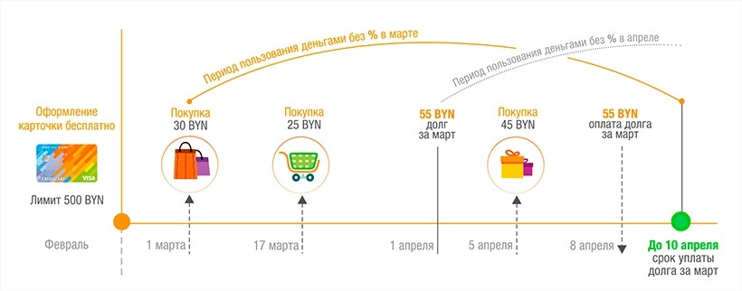Как это работает? Вы оформили Карточку Мечты – Dream Card с лимитом 500 BYNи 1 марта потратили 30 BYN, расплатившись ею. Затем 17 марта оплатили карточкой покупки на сумму 25 BYN. 5 апреля совершили очередное приобретение, потратив с карточки 45 BYN. Сумма ваших трат за март – 55 BYN– именно столько следовало заплатить до 10 апреля, что вы и сделали 8 апреля. Значит, банк не начислил проценты на сумму мартовских трат и в апреле вы также пользуетесь деньгами бесплатно.