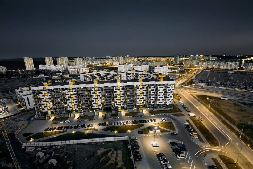 Современная архитектура зданий жилых домов, радующие глаз цвета и формы, соседство небольших магазинов, кафе, медицинского центра, паркинга.
