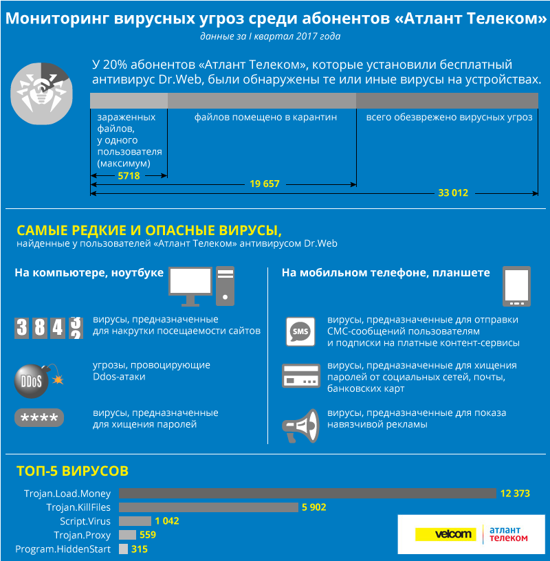 Каждый пятый компьютер в Беларуси заражен вредоносными программами. Чаще всего, вирусы заставляют смотреть рекламу, удаляют системные файлы и крадут ценные сведения – такой статистикой внешних угроз поделился интернет-оператор «Атлант Телеком», впервые предоставив абонентам возможность бесплатно установить лицензионный антивирус Dr.Web 10-й версии.
