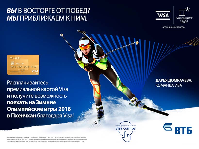 В честь Зимних Олимпийских игр 2018 года в Республике Корея компания Visa International при участии банка ВТБ проводит рекламную игру «Вперед к победам с Visa!».