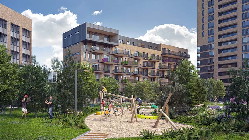 Много пространства и много света – такая концепция уже стала визитной карточкой компании А-100 Девелопмент. И Квартал-парк не стал исключением. Архитектурный стиль с отсылкой к постиндустриальной Англии, кирпичная фактура стен с антрацитовым металлом в различных элементах фасада – это красиво, графично и эффектно. При этом английскую сдержанность фасадов призваны дополнить яркие акцентные элементы в парке, на балконах и внутри подъездов. Стоит также учитывать, что среднеэтажная застройка и огромные французские окна дают ощущение простора, которого обычно так не хватает в городе.