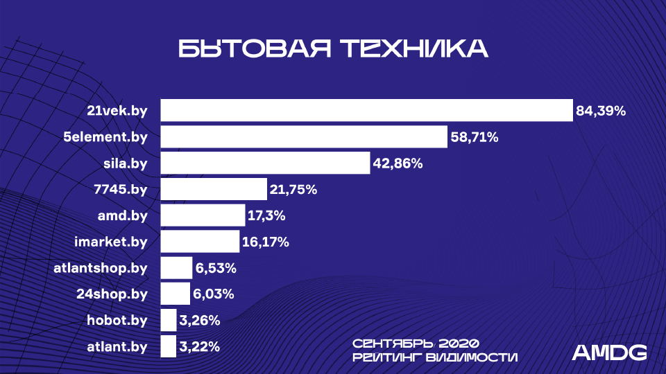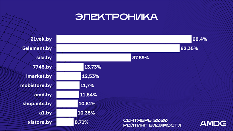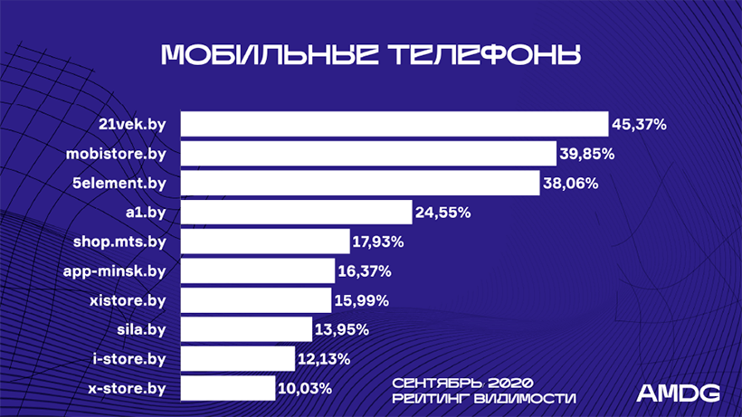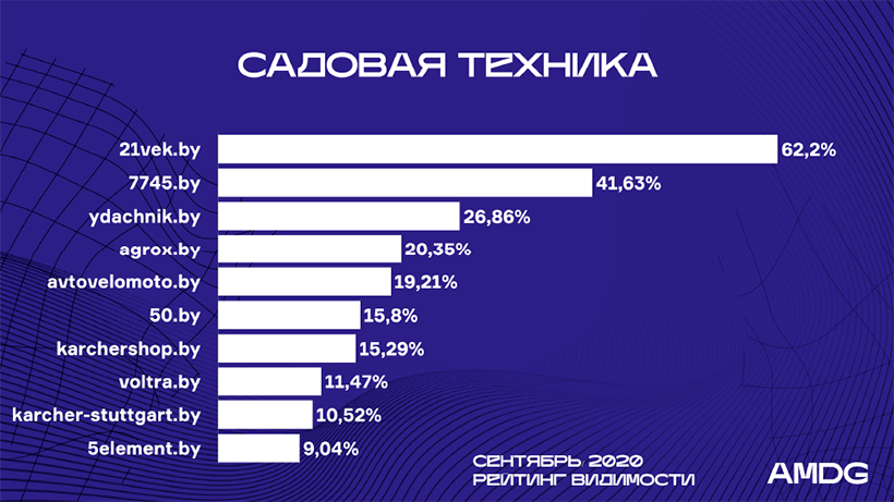 Значительно повысили позиции Imarket.by (с 7-й на 5-ю) , 7745.by (c 8-й на 4-ю), Amd.by (c 10-й на 7-ю) – их видимость выросла в среднем на 5%.