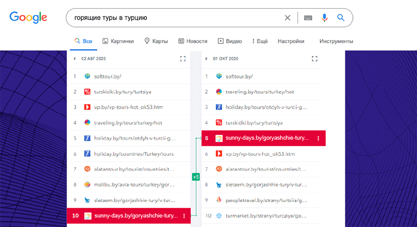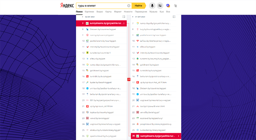 Один из лидеров прошлого рейтинга, Sunnydreams.by, неожиданно выпал из ТОПа, переместившись с 8-й на 42-ю позицию (-13% видимости).