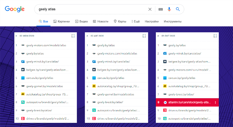 Atlantm.by совершил прыжок с 8-го на 5-е место. Одна из причин – рост позиций в частотных запросах, связанных с Geely Atlas. Отметим, что страница была добавлена в мае.