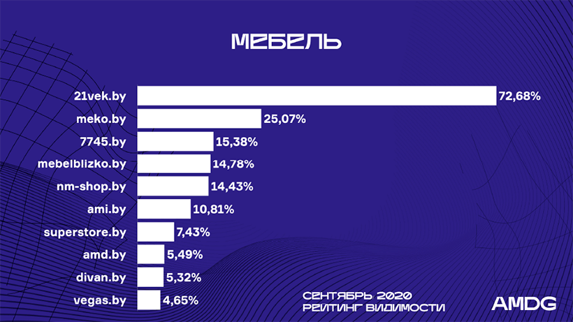 Nm-shop.by впервые за год покинул тройку лидеров и спустился на 5-ю позицию из-за роста на 4% сайта Mebelblizko.by и добавления в рейтинг 7745.by. Последний был добавлен в исследование категории мебели благодаря полноценному разделу мебели на сайте и хорошим позициям в выдаче.