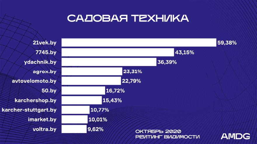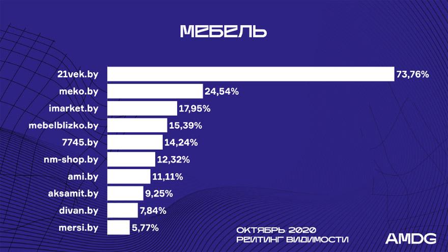 Imarket.by продвинулся c 13-й на 3-ю позицию, оттеснив ниже Mebelblizko.by и 7745.by. Здесь, как и в других случаях, рост запросов в Яндексе сделал Imarket.by одним из лидеров категории в октябре.