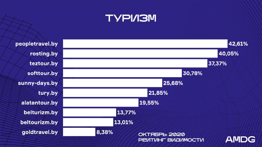 Souftour.by потерял 15% своей видимости и пальму первенства сентябрьского рейтинга. Peopletravel.by, новый лидер, наоборот, прибавил 15%, переместившись с 4-го места.