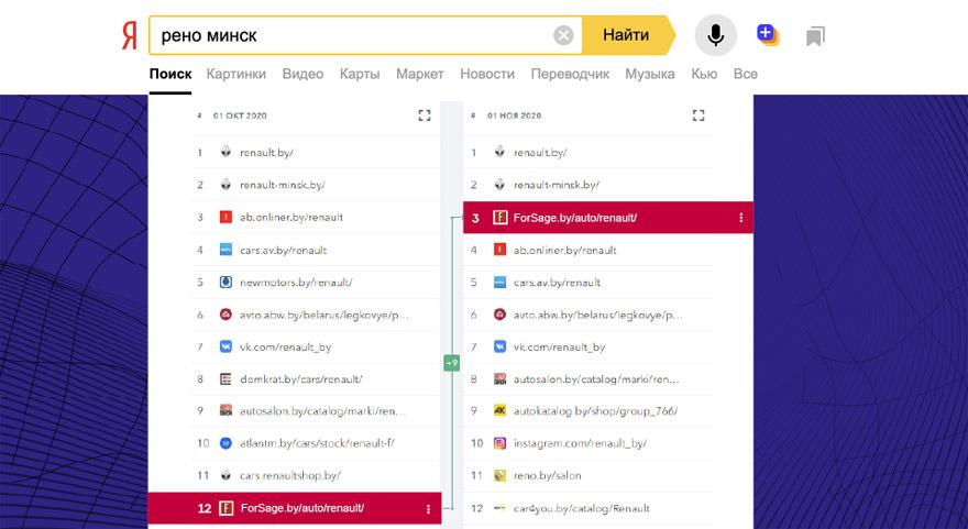 Newmotors.by спускается с ТОПа на 12-ю позицию (-3,3%). Его место занимает новый участник Forsage.by: рост видимости по наиболее частотным запросам (с 8% до 13,9%) позволил переместиться с 11-й на 6-ю позицию.