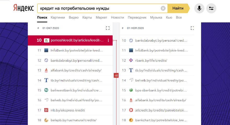 Pomoshkredit.by, также один из лидеров десятки прошлого месяца, ныне снижается практически до нуля (с 3,37% до 0,08%) и перемещается с 9-й на 19-ю строку.