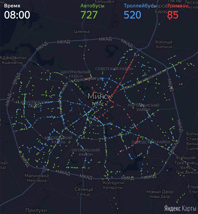 Яндекс.Карты показали один день из жизни наземного транспорта в Минске