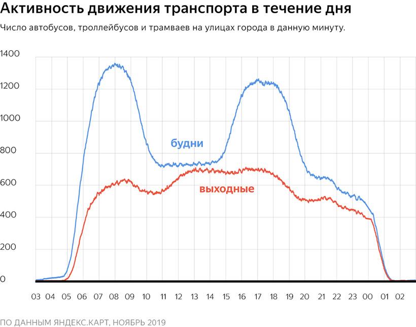 В выходные на линию выходит примерно на треть меньше машин. Выраженных часов пик нет: с семи утра до семи вечера активность движения держится примерно на одном уровне.