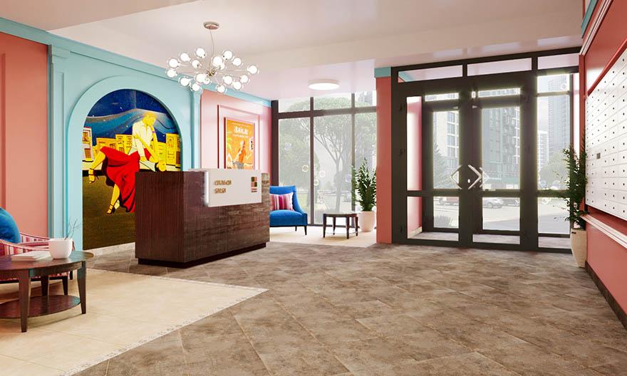 От главного входа к скоростным бесшумным лифтам фирмы OTIS – грузовому и панорамному – можно будет попасть через дизайнерские лобби. Здесь есть место для консьержа, зона отдыха и санитарная комната с пеленальным столиком и местом для мытья лап домашних питомцев.
