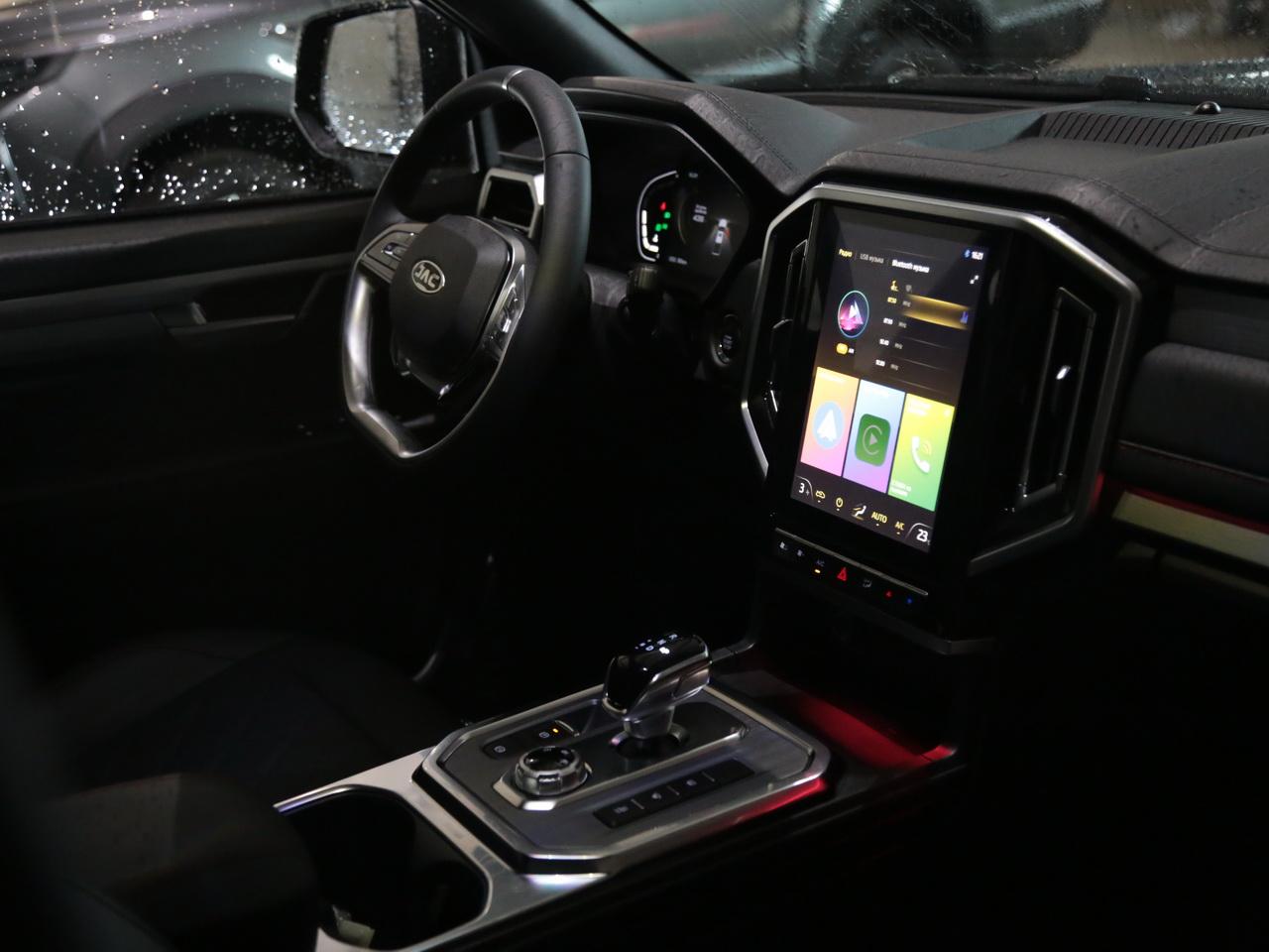 Поскольку пикап JAC T9 имеет большие габариты, для комфортной эксплуатации в стандартное оснащение включены передние и задние датчики парковки, а также камеры кругового обзора на 360 градусов. Изображение с камер транслируется на 10,4-дюймовый экран мультимедийной системы. Приборная панель также цифровая, 7-дюймовая.