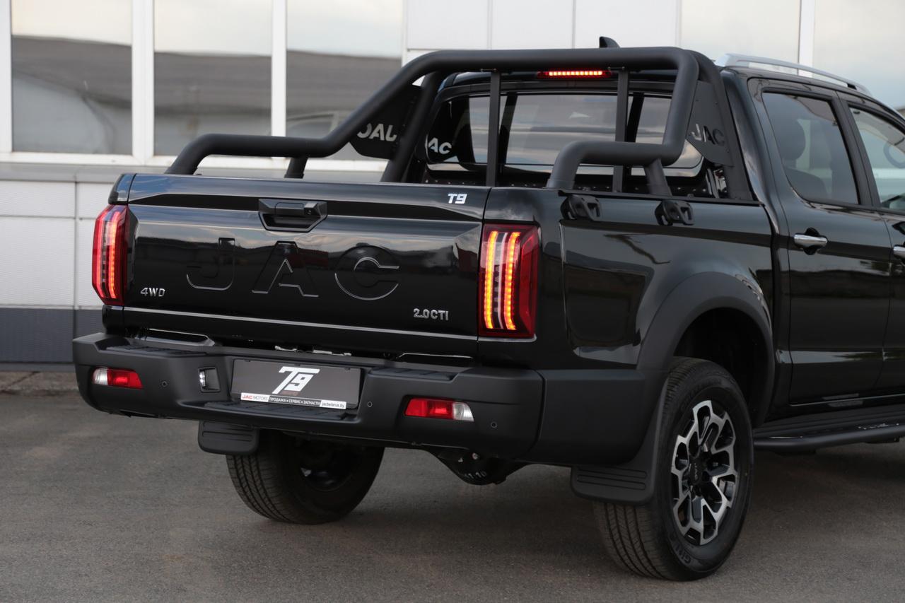 Пикап JAC T9 по габаритам заметно крупнее Т6 и Т8 – габаритная длина составляет 5 330 мм, ширина – 1 965 мм, высота 1920 мм. Колесная база – 3 110 мм. Такая размерность позволяет обеспечить комфорт пассажиров в салоне и практичность: в грузовой отсек помещается груз длиной 1 520 мм и шириной 1 590 мм.