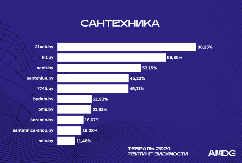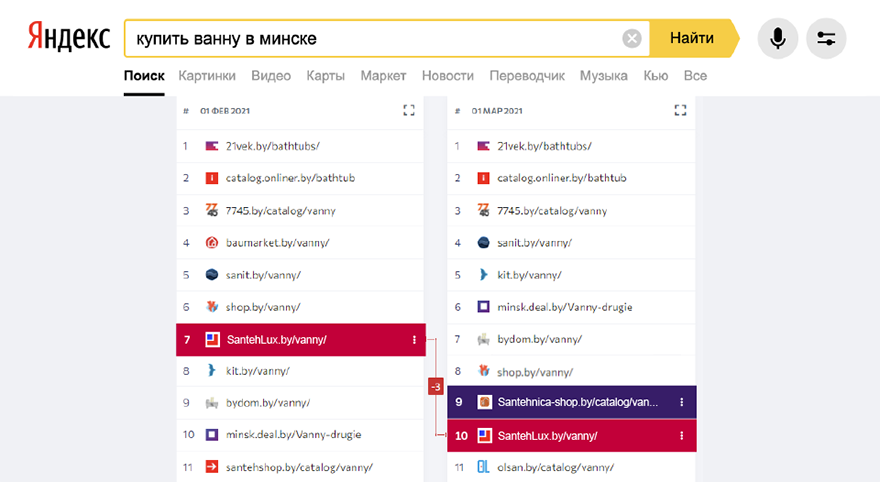Значительное снижение Santehlux.by (на -14%) вытеснило сайт из ТОП-3. Это дало возможность Sanit.by вновь оказаться в лидерах (+1,5%).