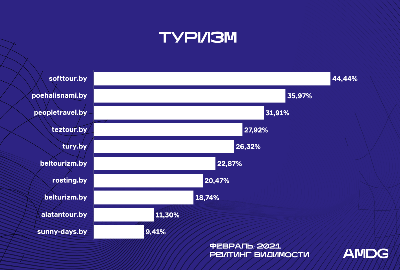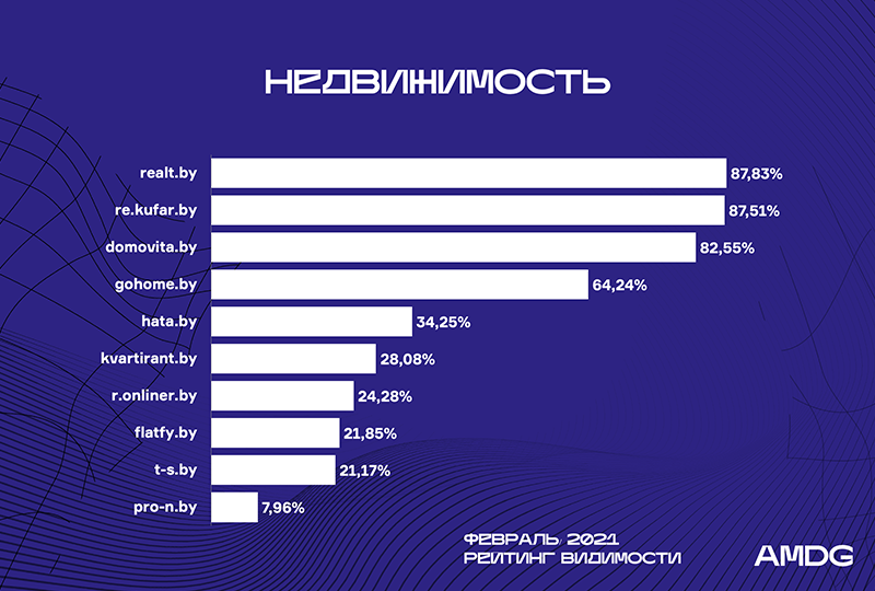 Digital-агентство AMDG продолжает ежемесячное исследование видимости белорусских сайтов. Что изменилось в категории «Недвижимость», почему в «Туризме» каждый месяц новый лидер и что общего у сайтов, позиции которых выросли или снизились? Подробнее читайте в новом обзоре за февраль.