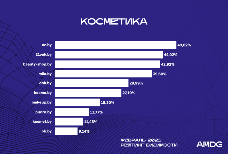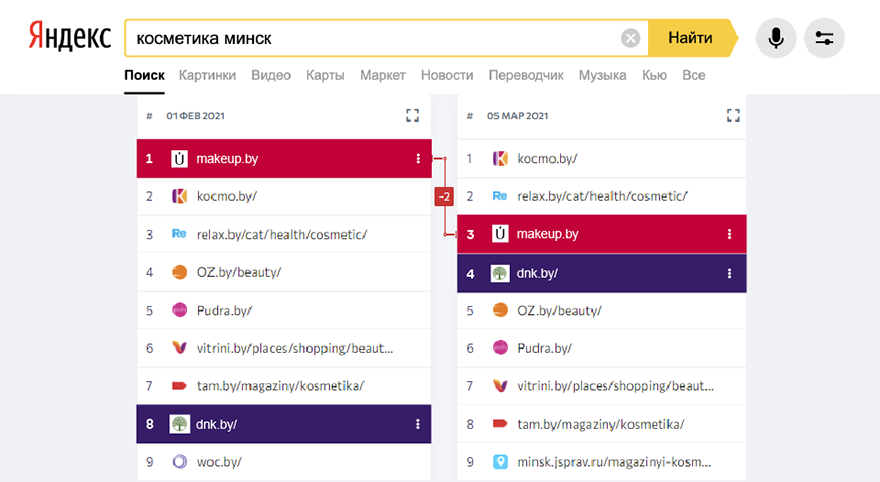 Dnk.by прибавляет в видимости (+9,89%) благодаря росту частотных запросов в Яндексе. По этой же причине, но в обратную сторону у Makeup.by отмечается снижение на 8,84%.