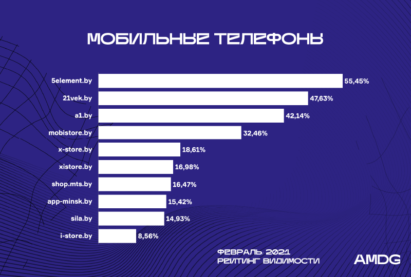 Монобрендовые сайты Apple X-store.by и I-store.by также прибавляют в видимости (+11,04% и +2,53%). Находясь около ТОПа в январе, в феврале они попадают в десятку (с 11-го и 12-го места).