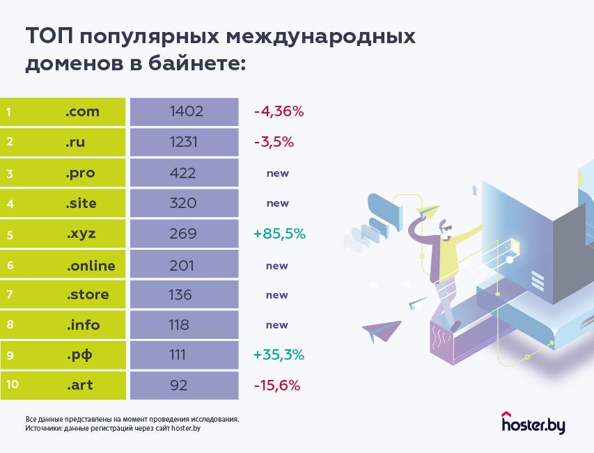 Международные доменные зоны пользуются популярностью у беларусов. В ТОП-5 самых популярных международных доменов 2020 года вошли .com, .ru, .pro, .site, .xyz. Среди них есть и доменные зоны, которые появились в Беларуси впервые — .pro, .site, .online, .store, .info.