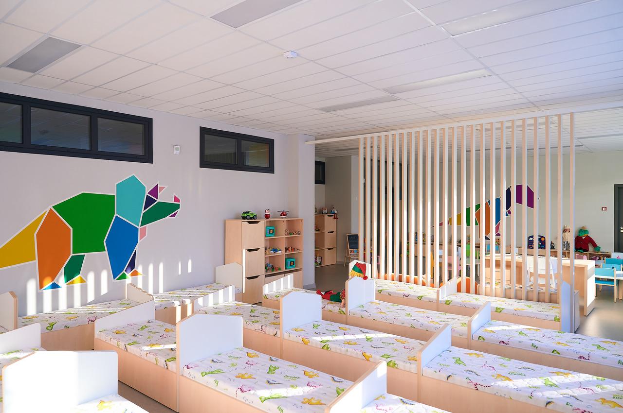 Детский сад рассчитан на 230 детей. Для каждой группы обустроены гардеробная, комната для занятий и спальня. В уборных установлены специальные мини-умывальники и раковины, подобранные под средний рост дошколят. Чтобы снизить нагрузку на глаза детей, свет испускают люминесцентные лампы.