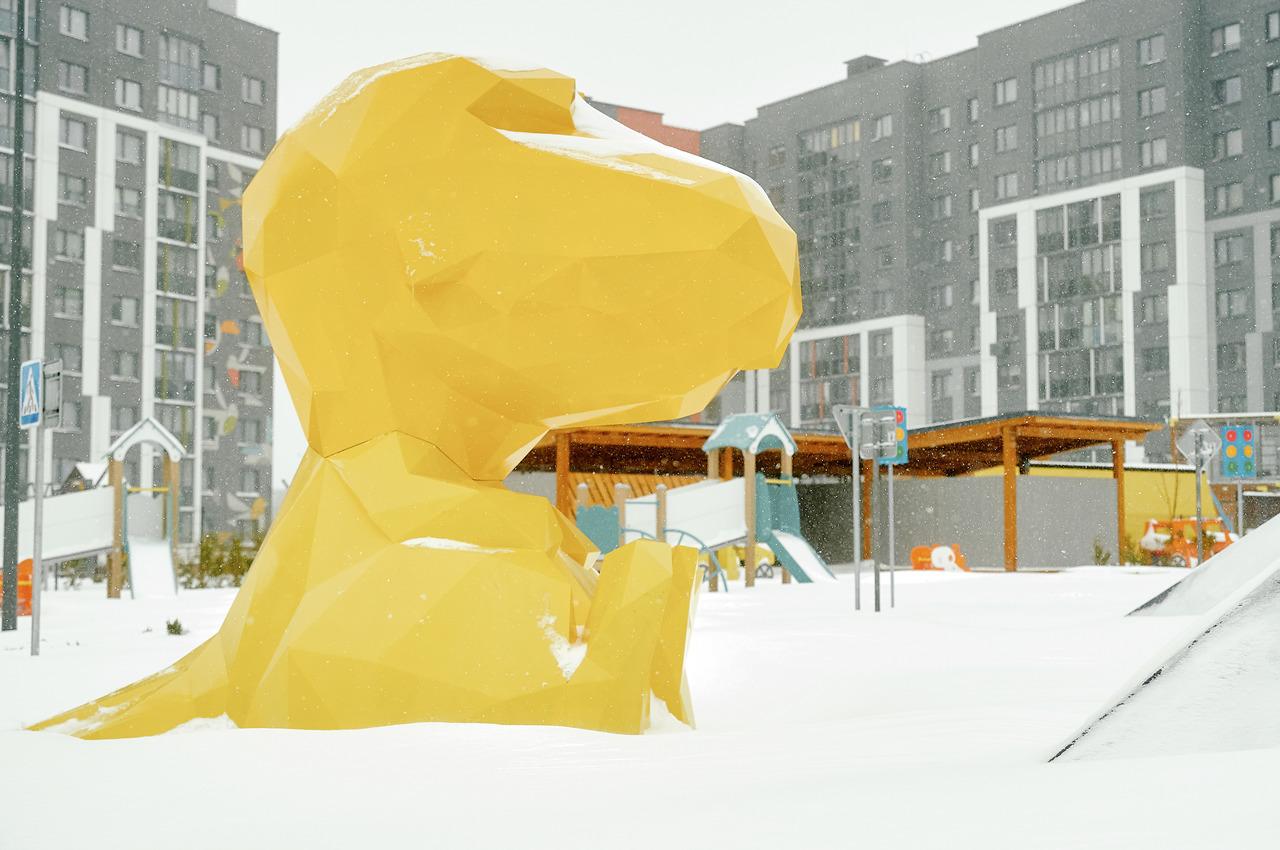 Тематика детсада прослеживается как внутри, так и снаружи корпуса. Динозавры встречают детей в коридорах, комнатах, на фасаде и игровых площадках. Местами они напоминают оригами из листов бумаги, чтобы ребята додумывали детали и развивали воображение. А со двора на садик «поглядывает» его талисман и символ – желтый двухметровый динозавр Дино.