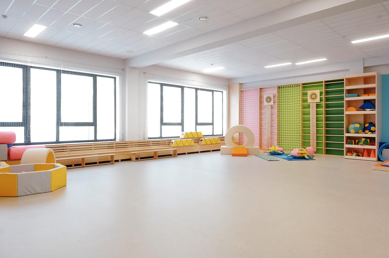 В здании обустроен спортзал с кольцами на стене, небольшим скалодромом и шведской стенкой. Рядом – музыкальный зал для утренников с мягкими местами для родителей. Также присутствуют кухня, прачечная, кабинеты психолога и дефектолога. Нашлось место и для медицинского блока с несколькими палатами-изоляторами на случай инфекций.