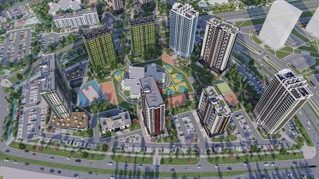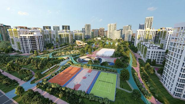 Квартал находится через дорогу от большого городского парка, который станет зелёным сердцем комплекса. Здесь появится много сочной зелени и цветов, фонтаны и зоны отдыха, спортивные и игровые площадки.