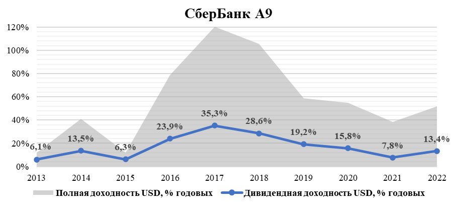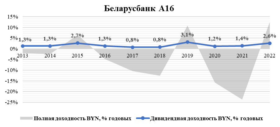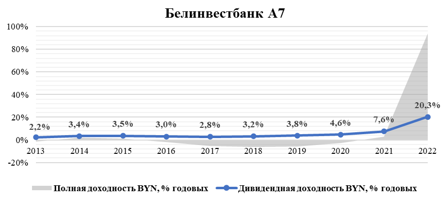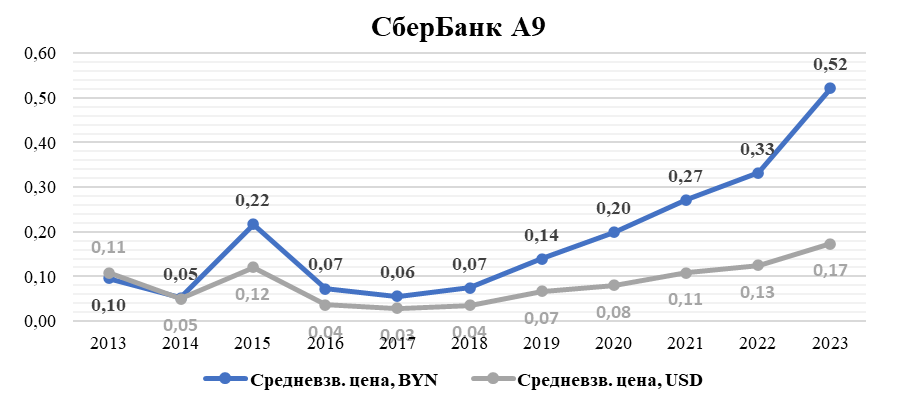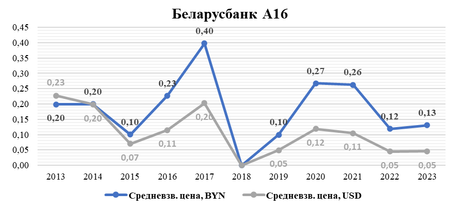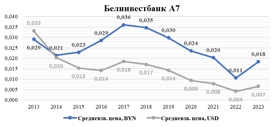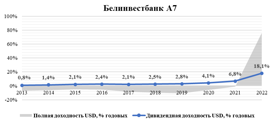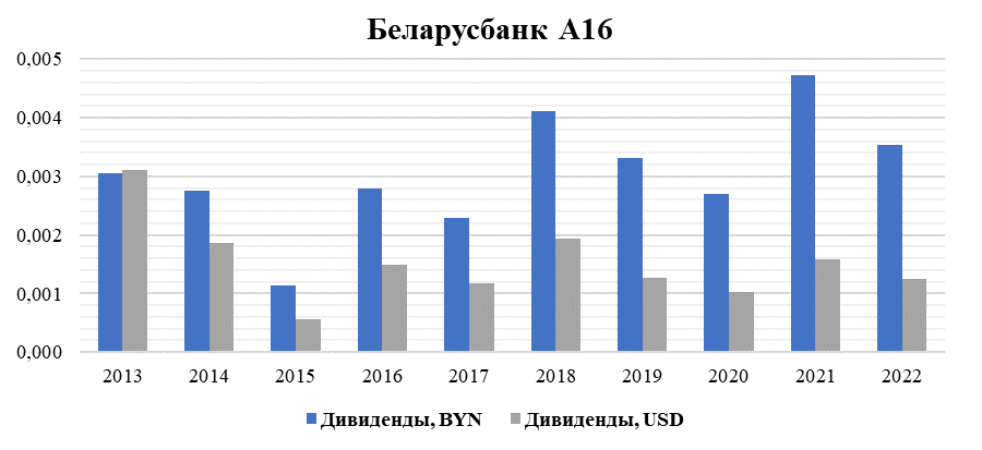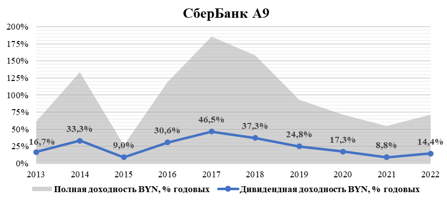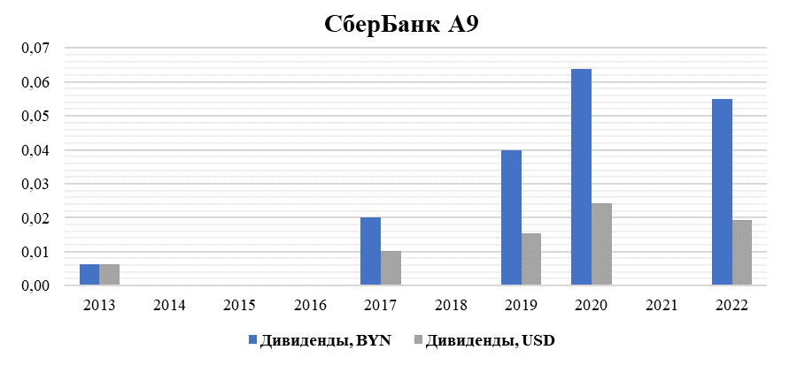 Репутацию акций белорусских банков, как инструмента для инвестирования, поддержали простые акции ОАО «Сбер Банк». Начиная с 2018 года они каждый год растут в цене: 2017/2023 – +604,6% в белорусских рублях и 384,0% в долларовом эквиваленте. Начиная с 2017 года банк только 2 раза не выплачивал дивиденды.