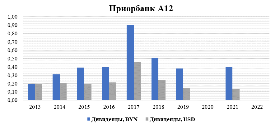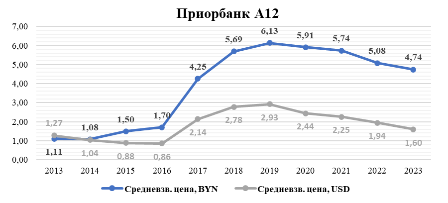 Простые акции «Приорбанк» ОАО в рассматриваемом периоде являются наиболее ликвидными среди индексных акций, только в 2022-2023 годах они по объему торгов уступают акциям ОАО «Минскпромстрой». Объем торгов за предыдущие 5 лет (тысяч рублей): 2018 – 230,5; 2019 – 621,5; 2020 – 548,1; 2021 – 573,7; 2022 – 477,4. Однако рост акций 2017-2019 годов сменился снижением цены, усилившимся в последние 2 года. Также стоит обратить внимание, что по итогам 2020 и 2022 годов банк не выплачивал акционерам дивиденды.