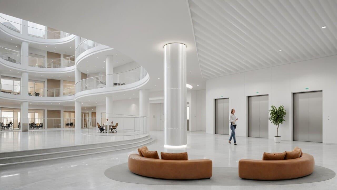 - Рецепция многофункциональных бизнес-апартаментов и главный вход в каждый из блоков расположены в центральном атриуме.