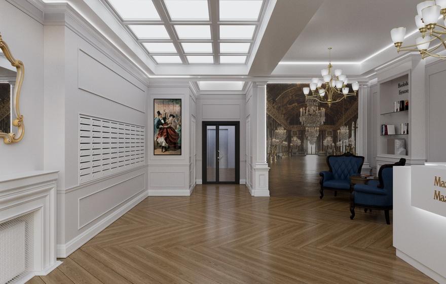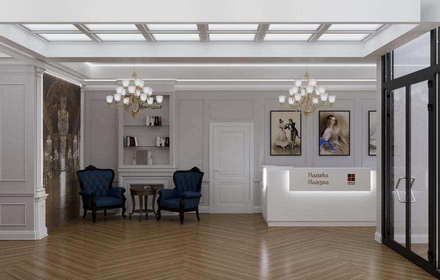 Лобби «Мазурка» выглядит более сдержанно, но в тоже время роскошно. Складывается ощущение, что попадаешь в гостиную XIX века, где совсем скоро пройдет бал.