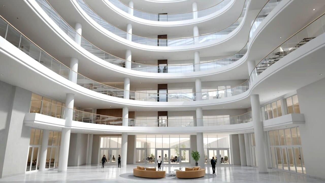 Этажность центрального атриума – 8 этажей. Высота 1 этажа атриума (от пола до пола) — 6,7 м. Высота типового этажа — 3,3 м. Высота верхнего 8 этажа – переменная, до низа несущих конструкций кровли от 5,6 до 7,2 м.