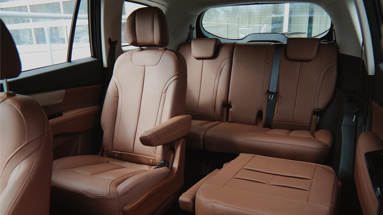 - Штурманское кресло также очень комфортное и имеет электрорегулировки, обогрев и вентиляцию. И что примечательно - капитанские кресла во втором ряду не уступают по удобству передним. На нашем рынке не часто встретишь отдельные сиденья для пассажиров сзади, хотя преимущества такой компоновки налицо: у каждого путешествующего есть свое личное пространство. Третий ряд просторный и без проблем разместит двоих взрослых пассажиров. Трое тоже усядутся, хоть и придется потесниться. Естественно, у второго и третьего рядов есть зарядные порты, регулировка обдува.