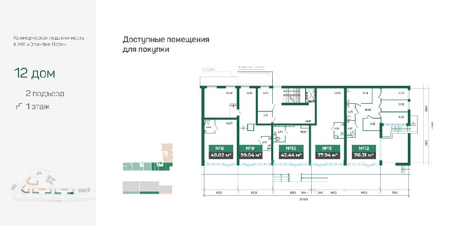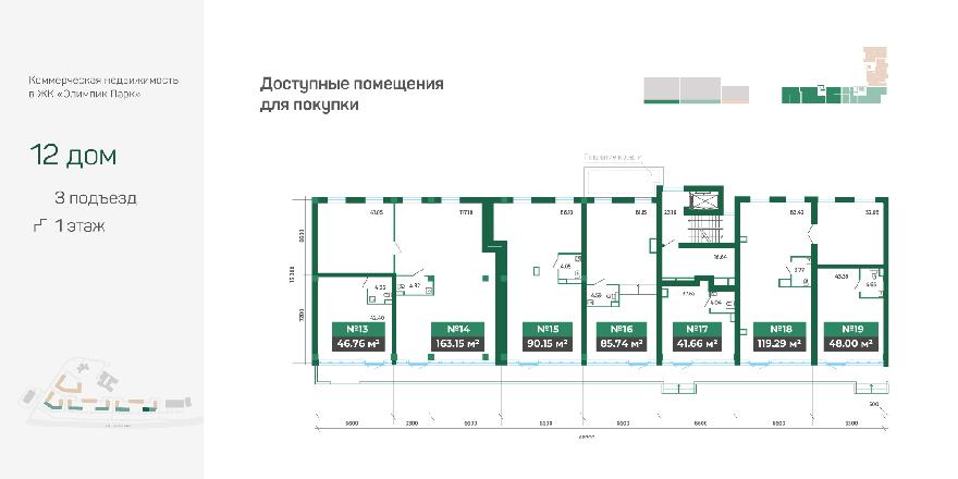Помещения административно-торгового назначения в новых домах «Олимпик Парка» расположены на въезде в квартал на первых этажах домов №12, №14, №15, №17 и №19 вдоль улицы Тимирязева. Это пространство по функциональному назначению может использоваться в сфере услуг, торговли или быть оборудовано под офисы. Площадь помещений варьируется от 41 м² до 368 м².