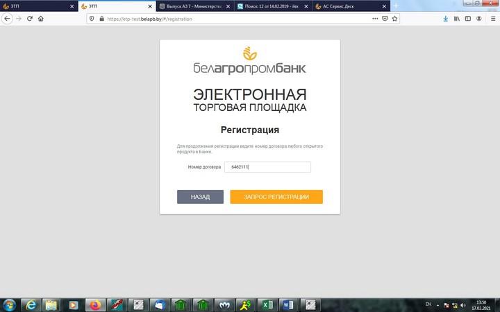 Для идентификации клиента необходимо ввести номер любого действующего договора с банком (текущий счет, текущий счет, доступ к которому обеспечен с использованием банковской платежной карточки, депозитный счет, кредитный договор).