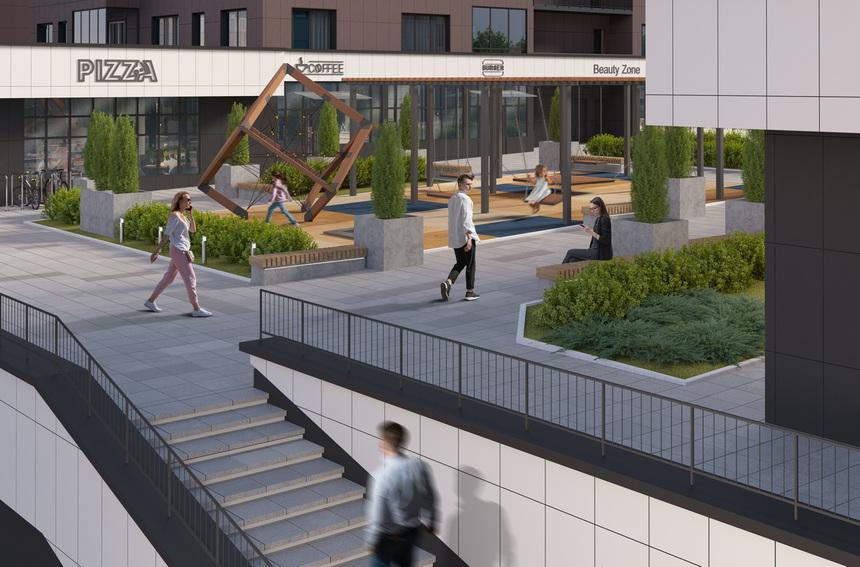 К проектированию дворовой территории застройщик подошел серьезно. Для жильцов и гостей комплекса предусмотрена пешеходная зона между вторым и третьим домом. Тут будут установлены навесы с качелями и скамейки с зелеными насаждениями, где можно будет отдохнуть после тяжелого дня, выпив чашку кофе или почитав книгу.