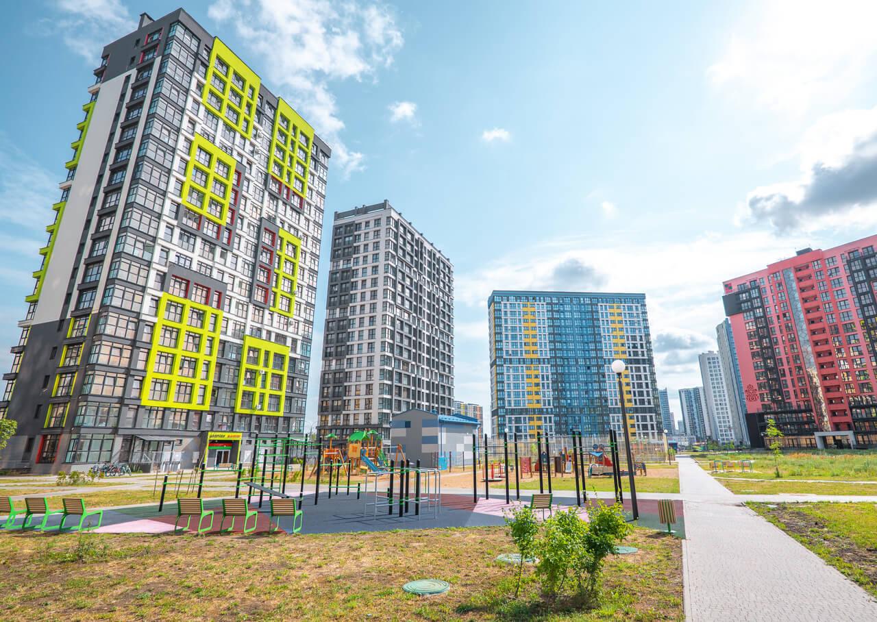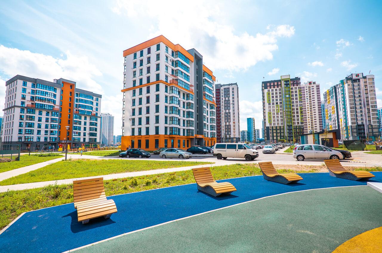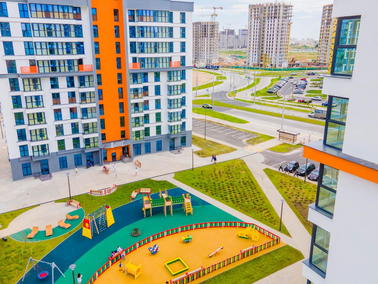 Из подъезда всегда есть два выхода. Один из них будет вести на безопасную прилегающую территорию, где обустроены яркие и безопасные детские площадки для игр и развития. Прилегающая территория в Minsk World – маленький парк, где есть места для отдыха детей, тренинга и релаксации взрослых (речь о территориях воркаута и скамейках для отдыха).