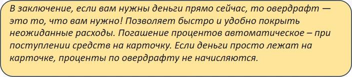 Процентная ставка по овердрафту составляет 13,5% годовых (СР+4п.п.). Однако в первые 30 дней после получения овердрафта проценты низкие и составляют всего 0,0001% годовых. Поэтому, если вы планируете погасить долг в течение месяца, у вас будет возможность сэкономить на процентах.