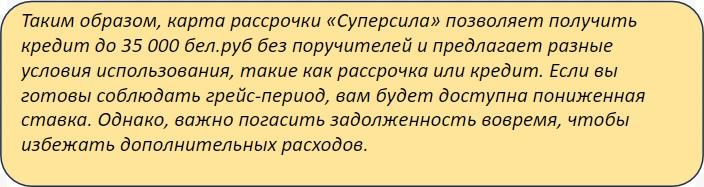 Существует еще одно привлекательное условие для владельцев карты рассрочки «Суперсила». Если вы сможете погасить потраченную сумму до 10-го числа следующего месяца и будете соблюдать грейс-период, ваша ставка по кредиту составит всего 9,99% годовых. Это значительно ниже стандартной ставки и позволит вам снизить выплаты по кредиту.