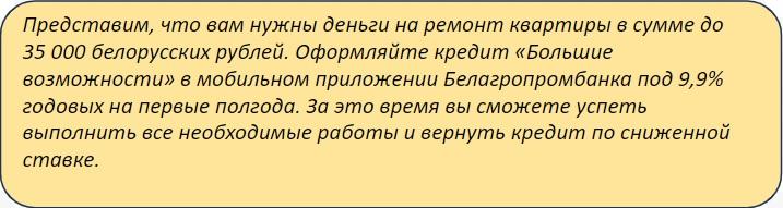 Однако, если вы решите оформить кредит с помощью мобильного приложения Белагропромбанка, то в течение грейс-периода (на протяжении первых 180 дней) процентная ставка составит 9,9% годовых. Это значит, что, оформляя кредит через приложение, вы сможете сэкономить как время, так и деньги.