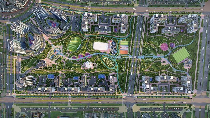 Центром притяжение комплекса станет Деловой квартал МФЦ и торгово-развлекательный центр MaraMall, где смогут работать и отдыхать сотни людей. Неподалёку появится огромный парк с аттракционами и фонтанами, зона отдыха и выгула домашних животных, спортивными и игровыми площадками.