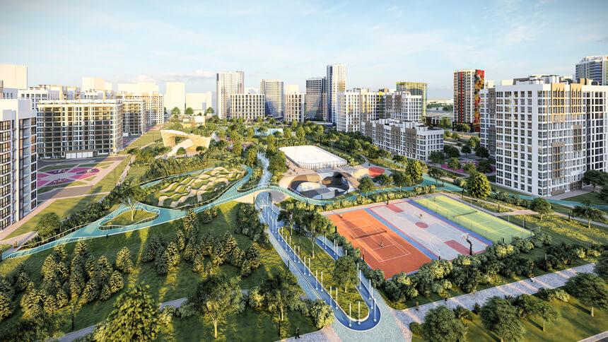 Под окнами этих комфортабельных новостроек появится новый городской парк с площадью озеленения около 40 га, стадионами и теннисным кортом.