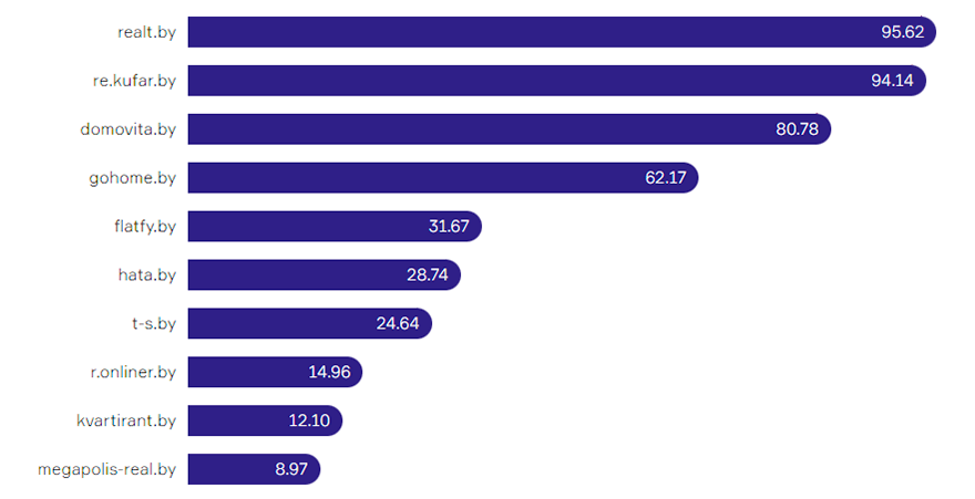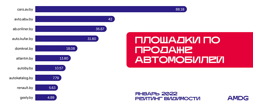 В ТОП-5 все лидеры немного прибавили в видимости. Так, ресурс cars.av.by с показателем 88,18% занимает первое место. В сравнении с предыдущим месяцем видимость выросла на 2,31%. На втором месте расположился avto.abw.by – у него 42% (за месяц +0,84%). Третье место принадлежит ab.onliner.by, показатель которого составил 36,87%. Domkrat.by, несмотря на снижение видимости на 1,76%, по-прежнему закрывает ТОП-5 с показателем 18,08%.